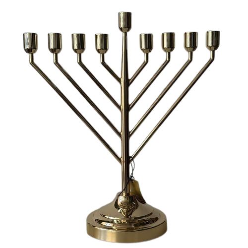 חנוכייה יוקרתית בעבודת מתכת איכותית, בציפוי זהב בוהק, בעיצוב חב״ד קלאסי עם קנים אלכסוניים הפונים מעלה בגאון.