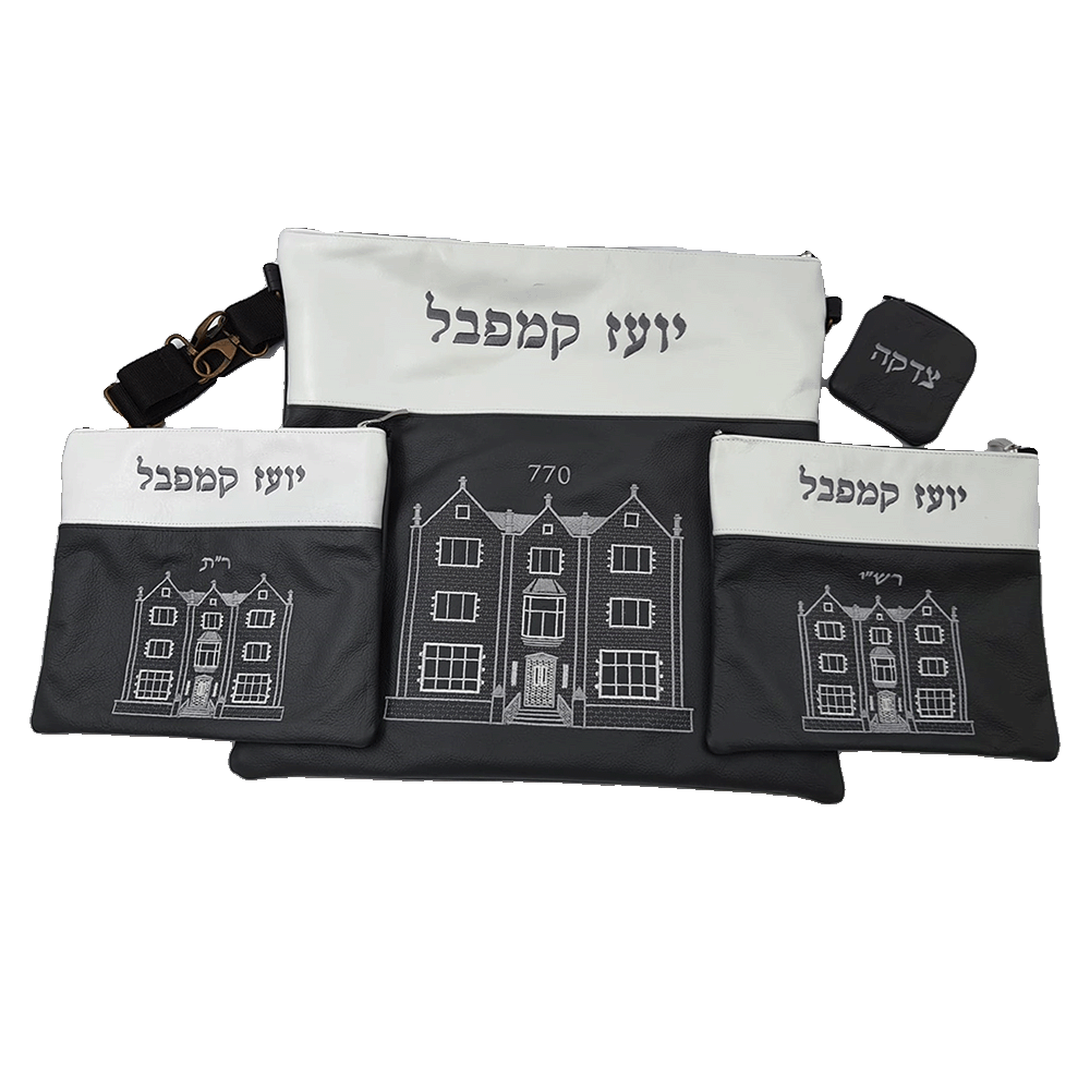 סט נרתיקי טלית ותפילין לחתן, מעור איכותי ומשובח, עבודת יד. הסט כולל: *שני נרתיקים לתפילין (רש"י ור"ת) *תיק גדול לטלית *רצועת נשיאה *תיקי אישי לצדקה *ריקמת שם על שלושת התיקים (ללא תוספת תשלום).