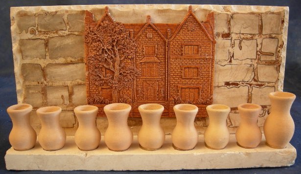 חנוכית חרס ושיש עם דגם 770 בגב החנוכיה