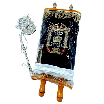ספר תורה כולל מעיל קטיפה איכותי ונרתיק נילון לשמירה, אצבע לס"ת מעץ וטס מצופה כסף. אריזה מהודרת בצורת ארון קודש גובה: 34 ס"מ.