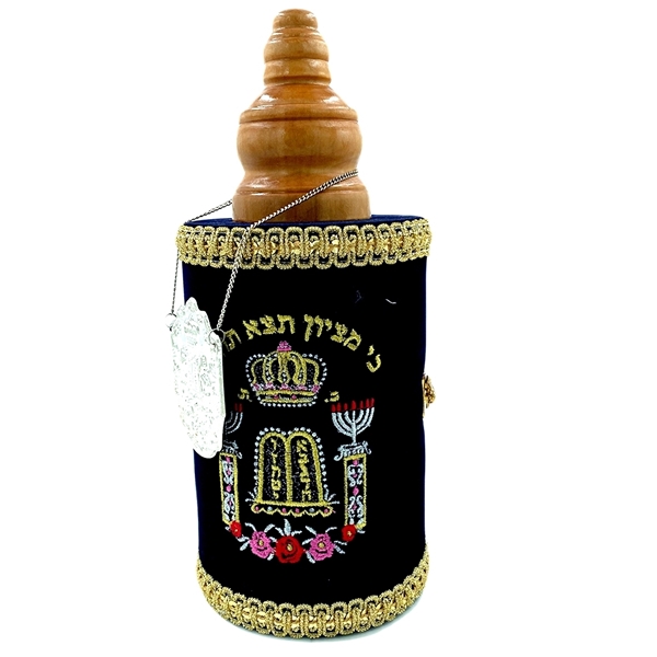 ספר תורה ספרדי עם נרתיק מעץ עטוף קטיפה, מתאים לילדים ולשמחת תורה.
